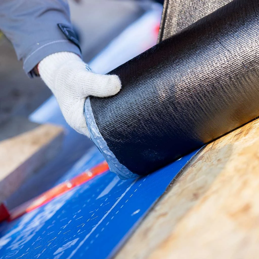 - Верхнее покрытие материала имеет отличную адгезию с битумом. Для создания герметичного перехлеста достаточно дополнительно обеспылить поверхность склеивания и склеить материал между собой. Материал клеится сам на себя и совершенно не требует применения мастики, тем самым сокращая время монтажа подкладочного ковра.