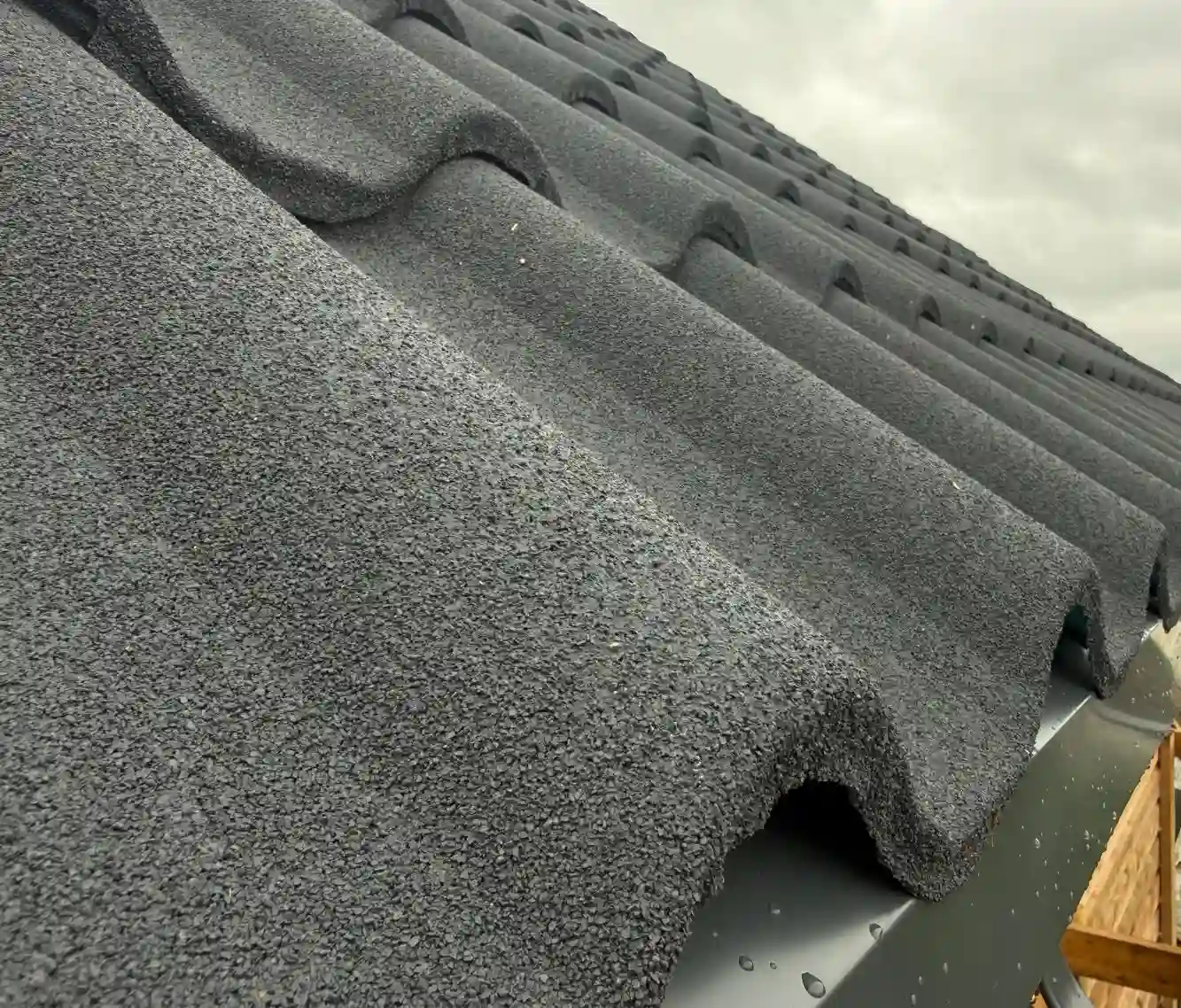 Композитная черепица StoneCover 1280 (1200) мм, графит с покрытием из каменной крошки представляет собой многослойный материал, состоящий из стального листа, покрытого алюмоцинковым сплавом, акриловой грунтовкой и слоем каменной крошки.