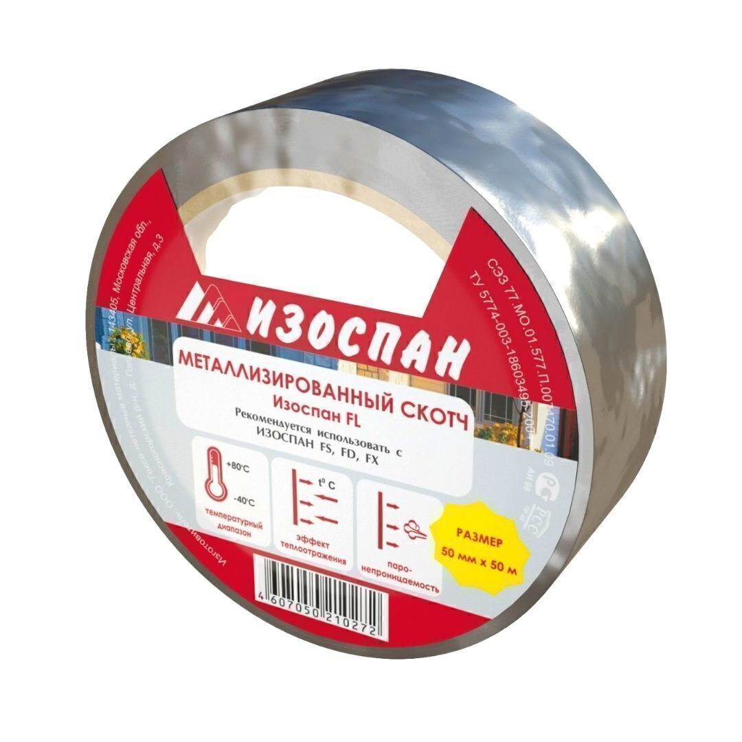 Скотч ИЗОСПАН FL фольгированный ширина 50 мм (50 м.п.) - металлизированная соединительная лента для герметизации и скрепления нахлестов полотен материалов Изоспан RF, Изоспан FD, Изоспан FS, Изоспан FX.
