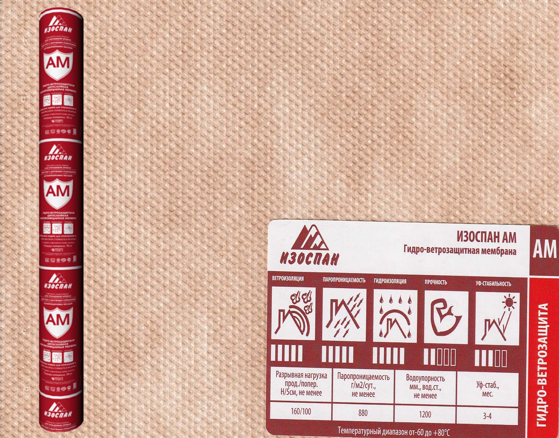 Изоспан AМ обладает водоупорностью, необходимой для защиты утеплителя и других внутренних элементов конструкций здания от подкровельного конденсата и атмосферных осадков, проникающих под внешнее покрытие (кровлю / наружную обшивку), при этом является паропроницаемым материалом, поэтому не препятствует выходу водяных паров из утеплителя в вентилируемый зазор. Гидро-ветрозащитная мембрана Изоспан AМ препятствует конвективному движению воздуха через теплоизоляцию, снижая теплопотери. Прочность материала способствует устойчивости к механическим нагрузкам и атмосферным воздействиям на этапе монтажа и в процессе эксплуатации.