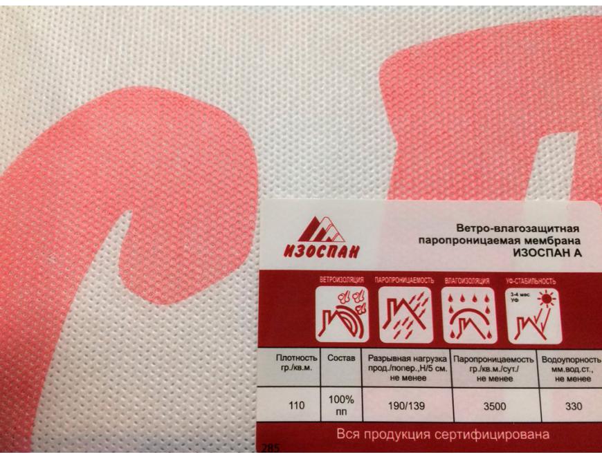 Ветрозащитная мембрана Изоспан A препятствует конвективному движению воздуха через теплоизоляцию, снижая теплопотери. Изоспан A обладает водоупорностью, достаточной для защиты утеплителя и других внутренних элементов конструкций стен от атмосферных осадков, проникающих под наружную обшивку, при этом является паропроницаемым материалом, поэтому не препятствует выходу водяных паров из утеплителя в вентилируемый зазор. Прочность материала способствует устойчивости к механическим нагрузкам на этапе монтажа и в процессе эксплуатации.