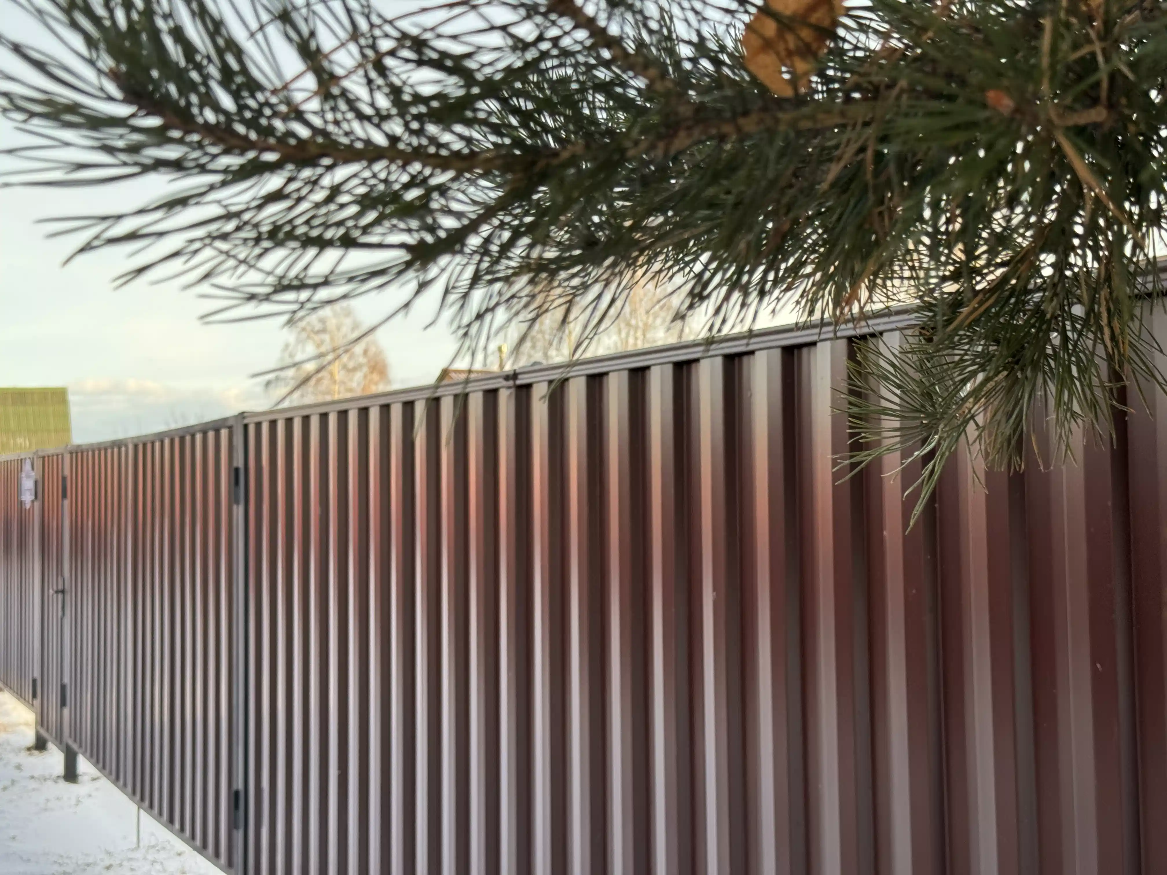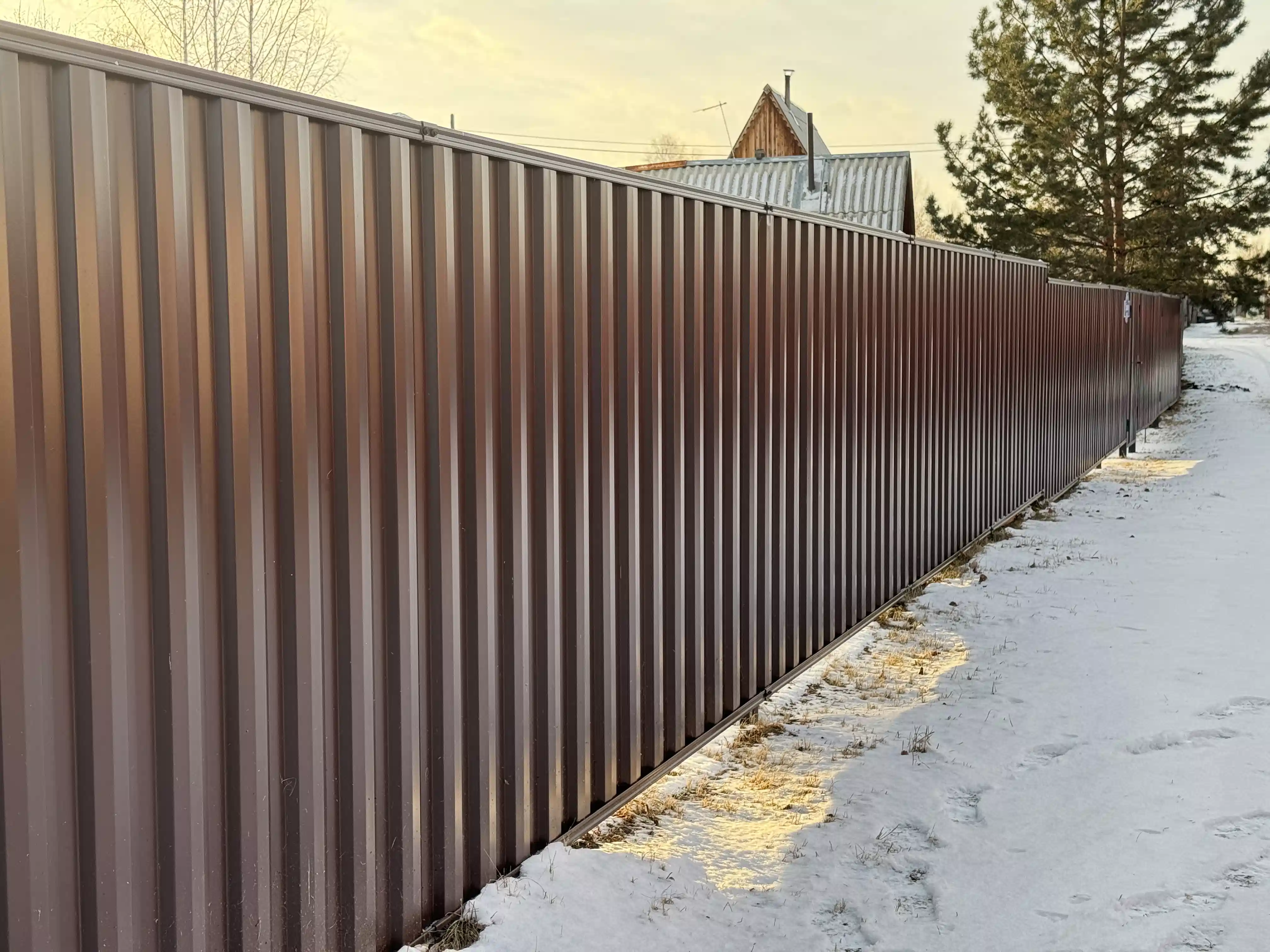 Сплошной забор с уникальным по форме профнастилом. Быстрая и удобная сборка без сварочных работ. Подходит как для монтажа на трубы Marsell 63х83 мм, так и для профильных труб с сечением 60*60 мм.